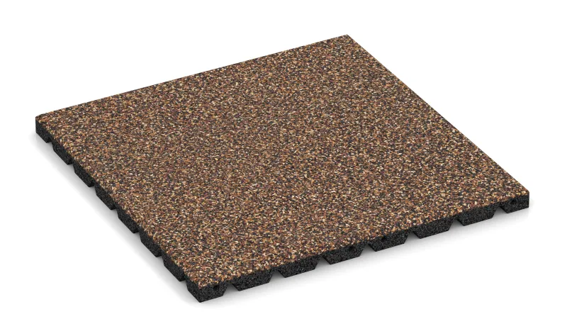 Die Platten bestehen aus PU-gebundenem Gummigranulat mit trittelastischer, griffiger Oberfläche. Dicke und Rohdichte bestimmen das Dämpfungsverhalten und damit die Fallhöhe nach EN 1177. Durch das 50 × 50 cm Raster bleiben Zuschnitte minimal, und Einzelplatten können bei Bedarf schnell getauscht werden.