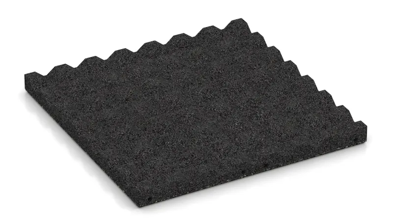 Die Platten bestehen aus PU-gebundenem Gummigranulat mit trittelastischer, griffiger Oberfläche. Dicke und Rohdichte bestimmen das Dämpfungsverhalten und damit die Fallhöhe nach EN 1177. Durch das 50 × 50 cm Raster bleiben Zuschnitte minimal, und Einzelplatten können bei Bedarf schnell getauscht werden.