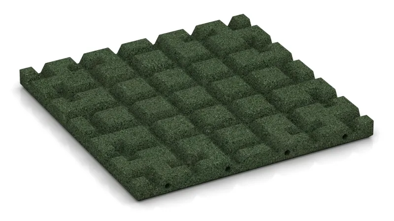Die Platten bestehen aus PU-gebundenem Gummigranulat mit trittelastischer, griffiger Oberfläche. Dicke und Rohdichte bestimmen das Dämpfungsverhalten und damit die Fallhöhe nach EN 1177. Durch das 50 × 50 cm Raster bleiben Zuschnitte minimal, und Einzelplatten können bei Bedarf schnell getauscht werden.