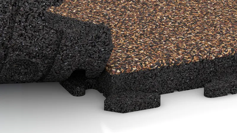 Die Platte besteht aus PU-gebundenem ELT-Gummigranulat, das aus dem Recycling gebrauchter Reifen stammt. Optional ist eine Variante mit einer farbigen Nutzschicht aus durchgefärbtem und UV-beständigem EPDM-Gummigranulat erhältlich. Beide Materialausführungen sind dauerhaft elastisch, robust und umweltfreundlich. Die Oberfläche ist rutschhemmend, trittelastisch und wasserdurchlässig – Regenwasser kann ungehindert in den Untergrund versickern. Dadurch wird der Boden nicht versiegelt, das natürliche Gleichgewicht des Bodens bleibt erhalten und Vegetation oder Baumwurzeln werden nicht beeinträchtigt.