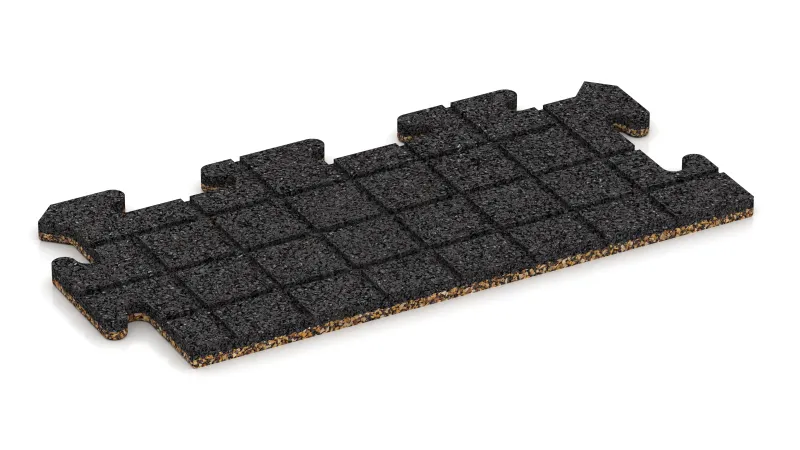 La piastra perimetrale garantisce una finitura ordinata e lineare lungo i bordi esterni di una superficie pavimentata. Ogni unità corrisponde a mezza piastra puzzle: il lato interno è dotato del consueto incastro a puzzle e si collega perfettamente alle altre piastre, mentre il lato esterno forma un bordo liscio e dritto. In questo modo l’intera superficie risulta funzionalmente ed esteticamente incorniciata.