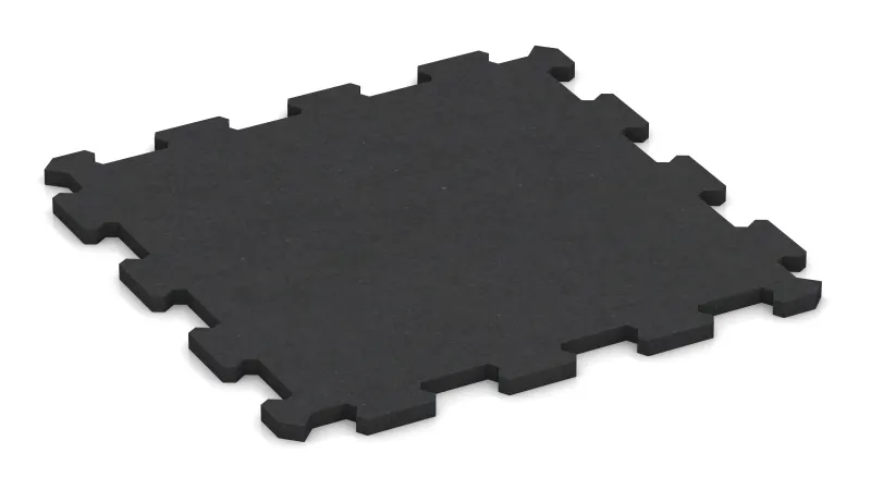 Ogni piastrella è realizzata in granuli di gomma legati con poliuretano. Grandi blocchi vengono pressati, lasciati riposare e poi tagliati con estrema precisione. Questo processo produce piastrelle calibrate con misure esatte e una superficie uniforme – un vantaggio evidente nella posa e nell’estetica finale.